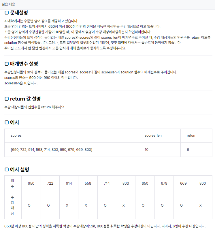 class Main { public int solution(int[] scores) { int count = 0; for (int i = 0; i < scores.length; i++) if (650 <= scores[i] **&&** scores[i] < 800) // 이 부분이 ||(or 연산자)로 되어있어서 수정했다. count += 1; return count; }