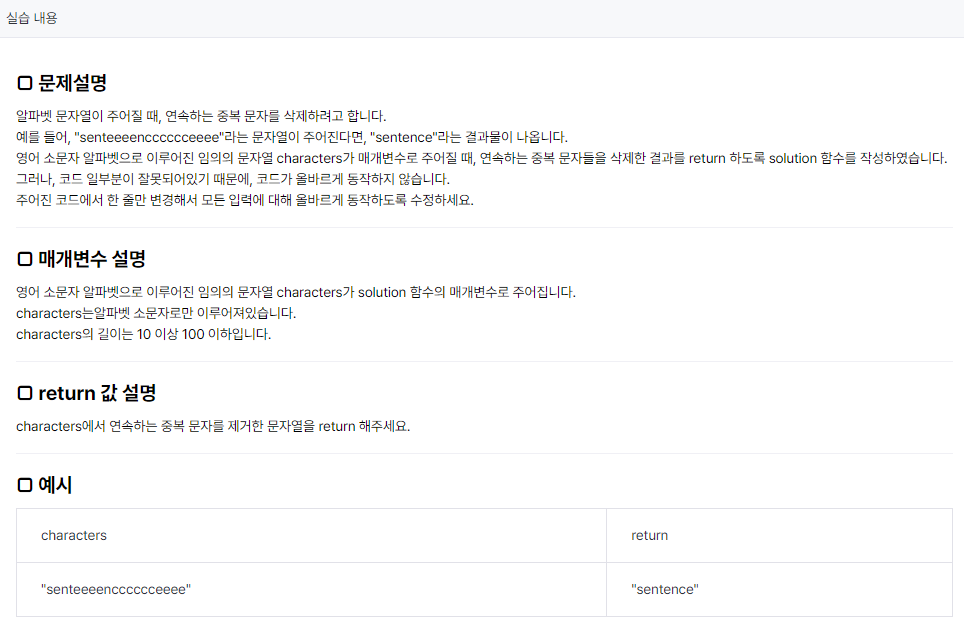class Main { public String solution(String characters){ String result = ""; result += characters.charAt(0); for (**int i = 1;** i < characters.length(); i++) { // int i = 0;으로 초기화 되어있던 것을 수정했다. if (characters.charAt(i - 1) != characters.charAt(i)) result += characters.charAt(i); } return result; }