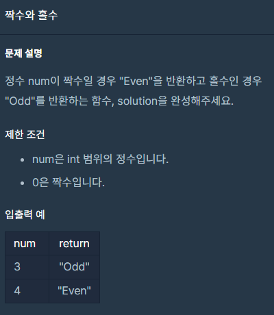 처음에 홀수인 것을 먼저 고려해서 홀수일 때 "Odd", 그 외에는 "Even"을 반환하는 식을 만들어야겠다고 생각하고 코드를 작성했다.