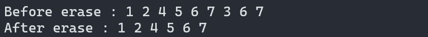 erase를 하기 전 예상했던 출력 결과는 "Before erase : 1 2 4 5 6 7 3 3 3"이였는데, 실제로 출력을 해보았을 때 "Before erase : 1 2 4 5 6 7 3 6 7"이 나오는 것을 볼 수 있습니다. 즉, 3이 시작되는 곳부턴 '없는 값'으로 인식하기 때문에 복사 비용을 줄이고, 더 효율적으로 작업을 처리할 수 있기 때문에 해당 결과가 나오는 것으로 보입니다.