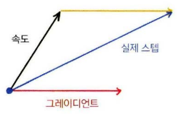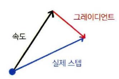 속도 벡터는 현재 이동하는 속도를 나타내고 그래디언트 벡터는 현재 속도로 한걸음 미리 가본 위치에서 내리막길 방향을 의미한다. 네스테로프 모멘텀은 현재 속도 벡터와 현재속도로 한 걸음 미리 가본 위치의 그래디언트 벡터를 더해서 다음위치를 정한다.
