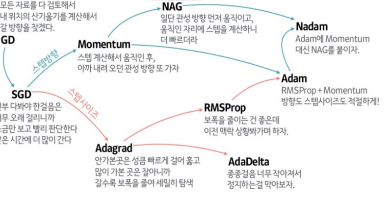 Adam(adaptive moemnt estimation)은 SGD 모멘텀과 RMSProp이 결합된 형태로 진행하던 속도에 관성을 주고 동시에 최근 경로의 곡면의 변화량에 따라 적응적 학습률을 갖는 알고리즘이다.