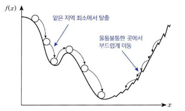 손실 함수의 차원이 높을수록 안장점을 쉽게 만날 수 있는 만큼 확률적 경사 하강법이 학습을 중단할 가능성도 커진다. 다행히 안장점은 최대와 최소가 만나는 지점이므로 조금만 움직여도 내리막길이 나타난다. 안장점은 이러한 지형적 특성이 있으므로 진행하던 속도에 관성을 주면 안장점에서 쉽게 탈출할 수 있다.