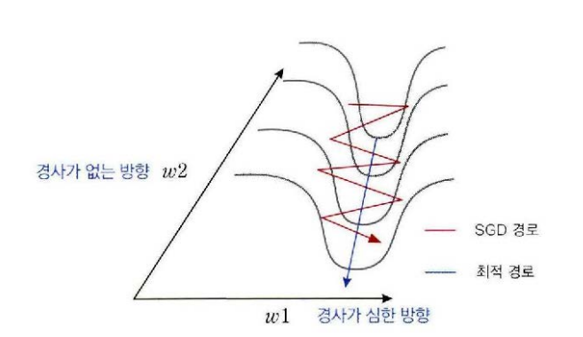 가로 방향으로는 경사가 매우 가파르고 세로 방향으로는 경사가 거의 없는 폭이 좁고 깊은 협곡이 있다고 하자. 확률적 경사 하강법은 이런 지형을 만나면 계곡의 벽면사이를 왔다갔다 하면서 진동만 하고 아래쪽으로는 잘 내려가지 못한다. 결국 최적해가 있는 곳에 도달하지 못하고 정체된 상태로 학습이 종료될 수 있다.