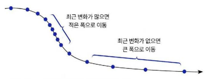 경사가 가파를 때 큰 폭으로 이동하면 최적화 경로를 벗어나거나 최소지점을 지나칠 수 있으므로 적은 폭으로 천천히 이동하는 것이 좋고 경사가 완만하면 큰 폭으로 빠르게 이동하는 것이 좋다. 따라서 곡면의 변화에 따라 학습률이 적응적으로 조정된다면 안정적으로 학습할 수 있다. 이와 같이 학습의 진행 상황이나, 곡면의 변화를 알고리즘 내에서 고려해서 학습률을 자동으로 조정하는 방식을 적응적 학습률(adaptive learning rate)이라고 한다.