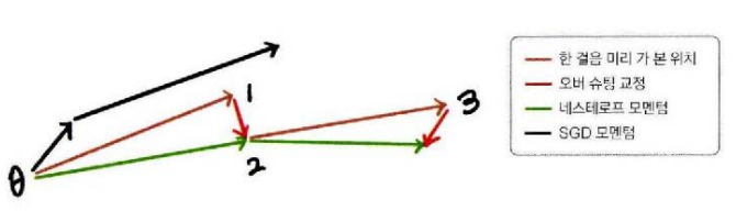 네스테로프 모멘텀(Nesterov momentum)은 진행하던 속도에 관성을 준다는 점은 SGD 모멘텀과 같지만 오버슈팅을 막기 위해 현재 속도로 한걸음 미리 가보고 오버슈팅이 된 만큼 다시 내리막기로 내려가기 때문에 이동방향에 차이가 있다.