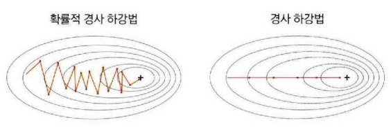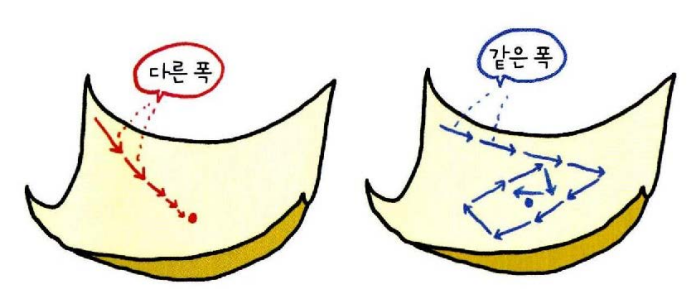 오른쪽 경사 하강법은 그래디언트가 정확하기 대문에 최적해를 향해 곧바로 내려가지만 왼쪽 확률적 경사 하강법은 그래디언트가 부정확하기 때문에 실제 내리막길이 아닌 근사된 내리막길로 가느라 여기저기 둘러서 최적해로 간다. 따라서 최적화경로는 길어지고 수렴 속도는 느려질 수밖에 없다. 최적화 경로가 최적해를 향해 일관성 있게 진행하려면 손실함수의 표면이 거칠더라도 민감하게 경로를 바꾸지 말하야 한다.