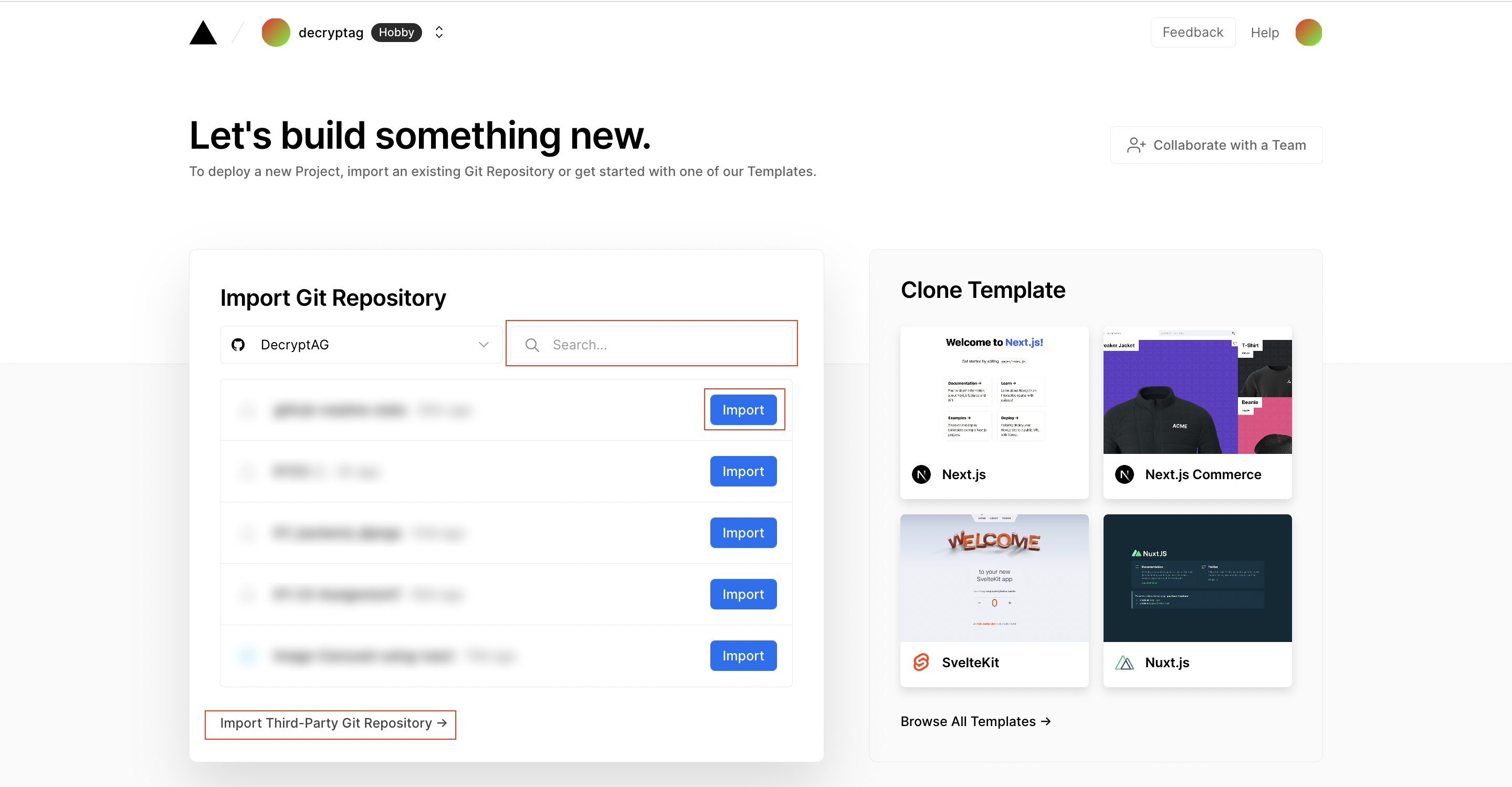 9. Click the Continue with GitHub button, search for the required Git Repository and import it by clicking the Import button. Alternatively, you can import a Third-Party Git Repository using the Import Third-Party Git Repository -> link at the bottom of the page.