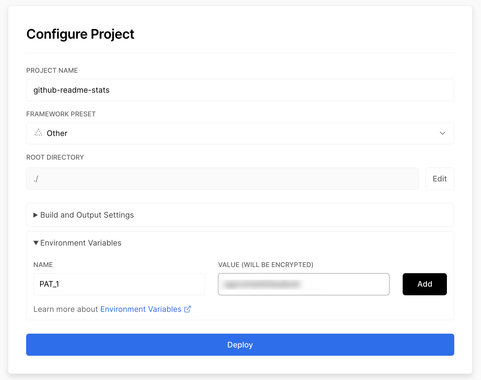 Since the GitHub API only allows 5k requests per hour, my https://github-readme-stats.vercel.app/api could possibly hit the rate limiter. If you host it on your own Vercel server, then you do not have to worry about anything. Click on the deploy button to get started!
