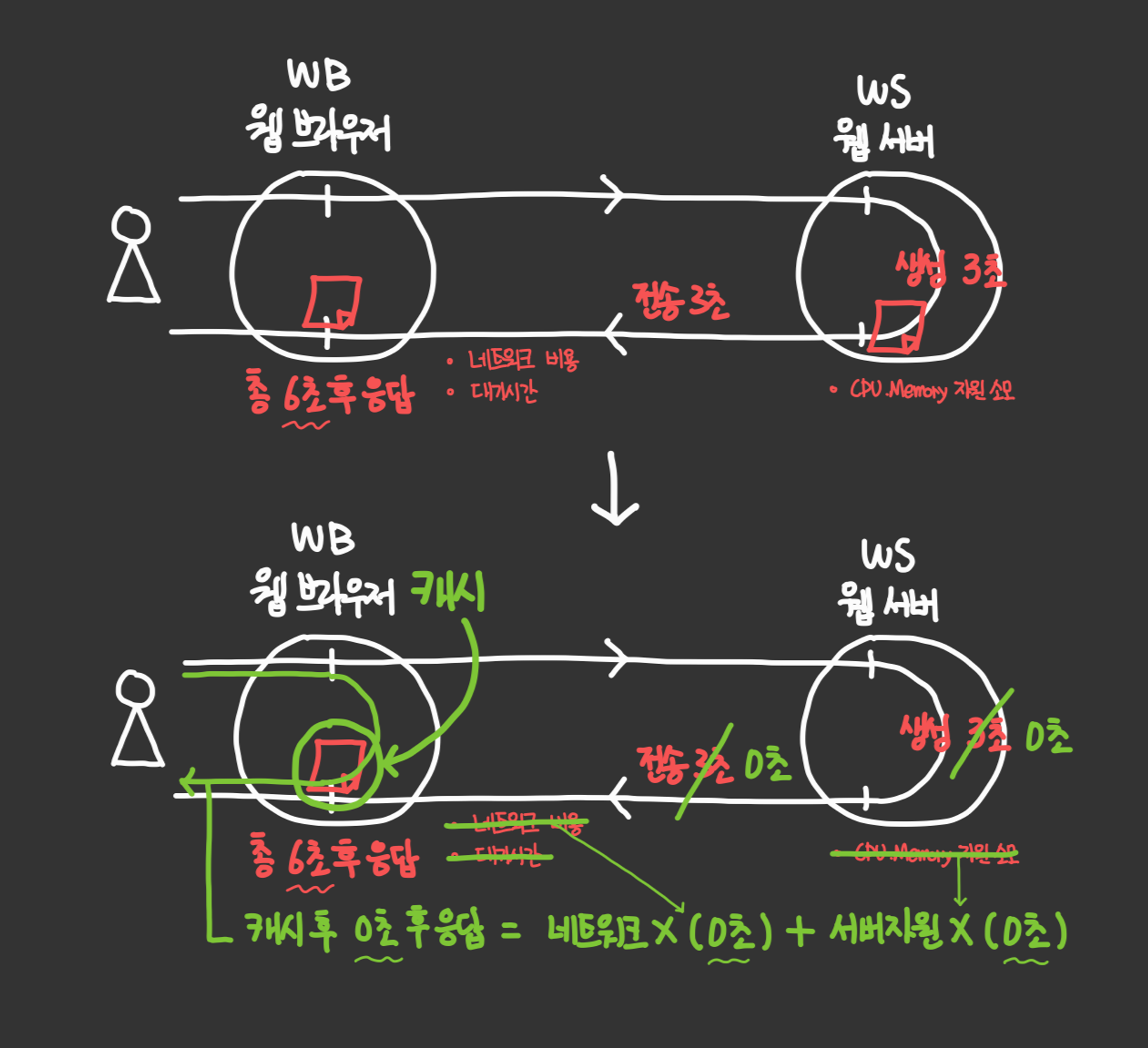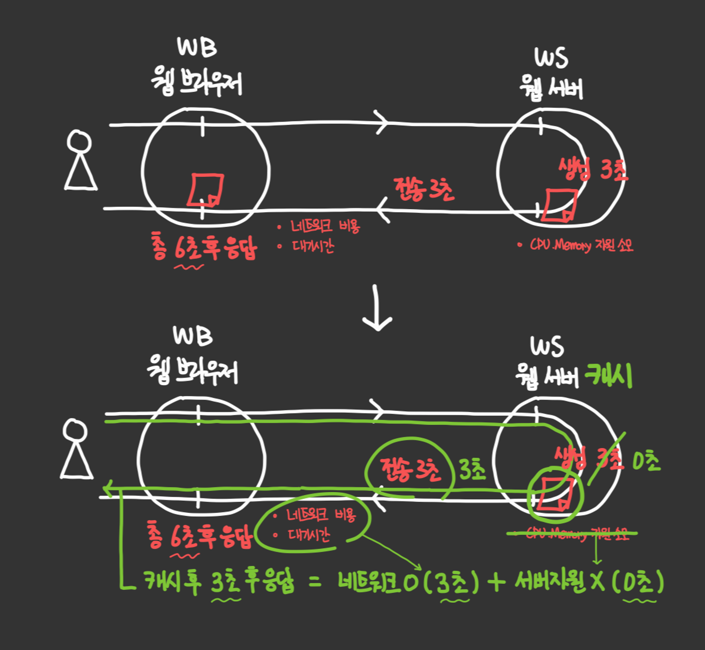 웹 서버는 요청을 반환하고, 웹 브라우저는 반환받은 코드를 컨텐츠화 하여 보여주게 됩니다. 클라이언트와 서버 둘 다 요청에 대한 일이 발생하게 되는데 만약, 웹 페이지의 내용이 같다면 어떨까요? 같은 페이지를 계속 반환하고 그려주며 리소스를 낭비하게 됩니다. 일반 웹 페이지의 경우에도, 사이트의 로고 같은 거라던가, 사이트의 구조 같은 경우는 잘 바뀔일이 없기 때문에 매번 호출하는 경우 이것도 낭비가 됩니다.