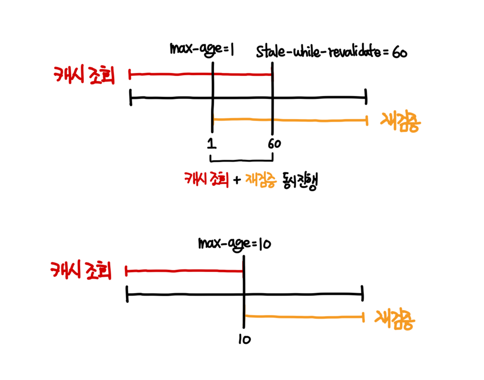 -stale-while-revalidate: 현재 캐싱된 컨텐츠를 즉시 로드하는 즉시성 + 미래에 업데이트 된 캐싱 컨텐츠가 사용될 수 있도록 보장하는 최신성. 재검증 요청을 동시에 하며 오래된 캐시를 반환함.