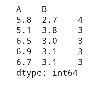 df_iris[['A', 'B']].value_counts().head()