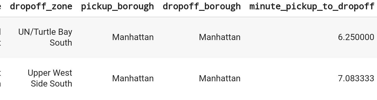 df['minute_pickup_to_dropoff'] = (df.dropoff - df.pickoff).dt.total_seconds()/60 # 분으로