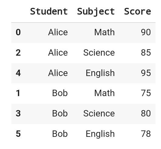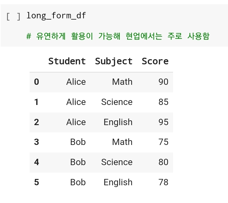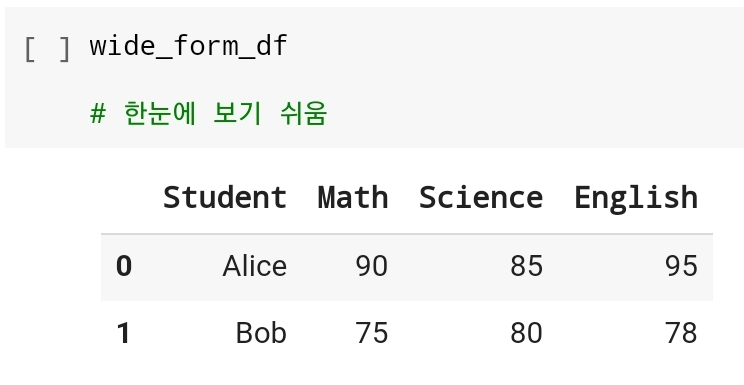 - Unpivot (melt) 예시 : 넓은 형식(Wide Form)에서 긴 형식(Long Form)으로 변환