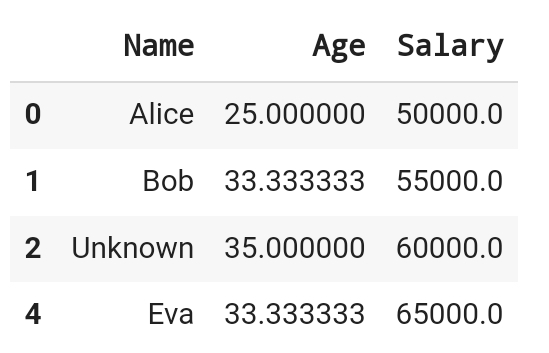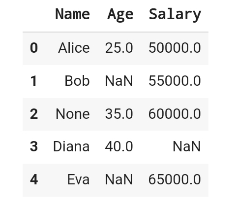 데이터셋에는 'Name', 'Age', 'Salary'열이 있고, 각각의 열에는 누락된 값이 포함되어 있다.