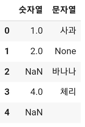 '문자열' : ['사과', None, '바나나', '체리', '']}