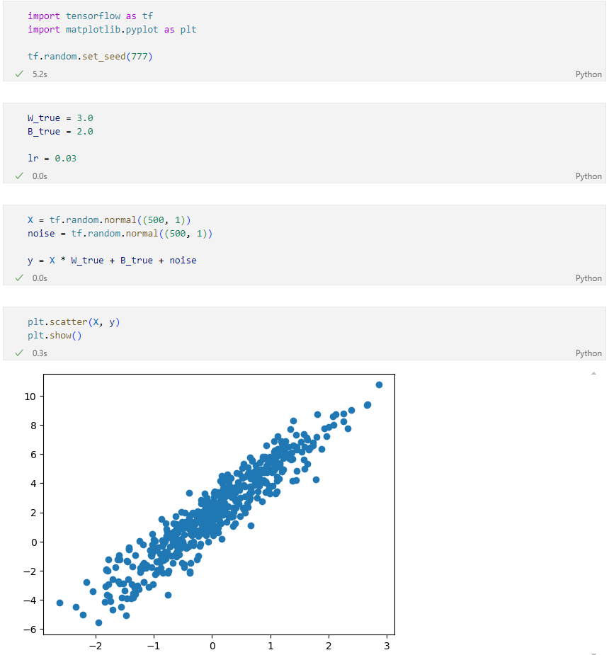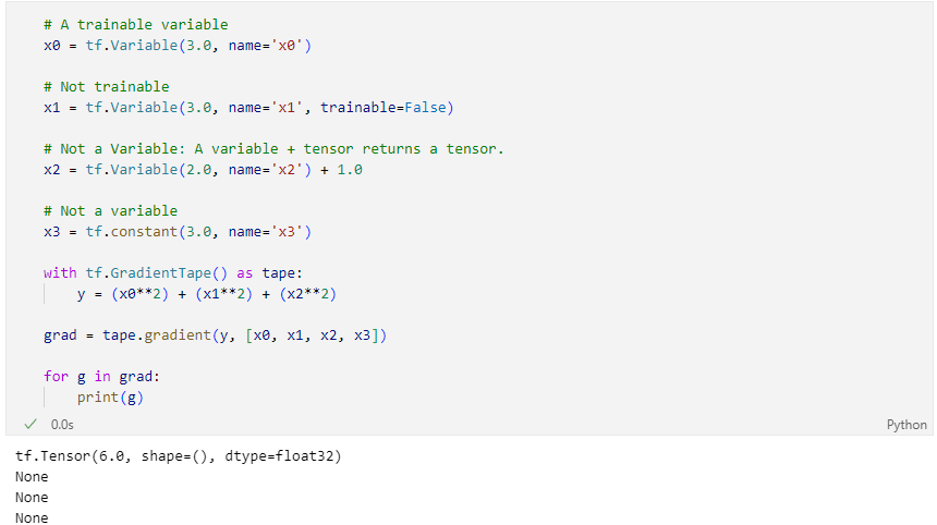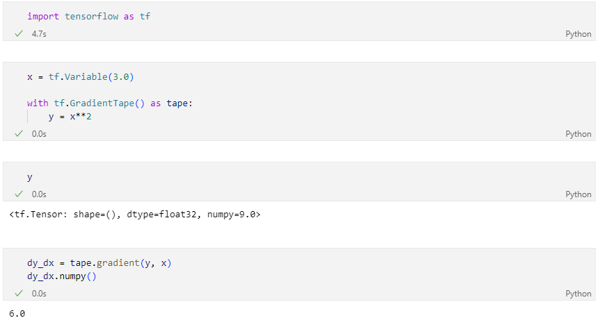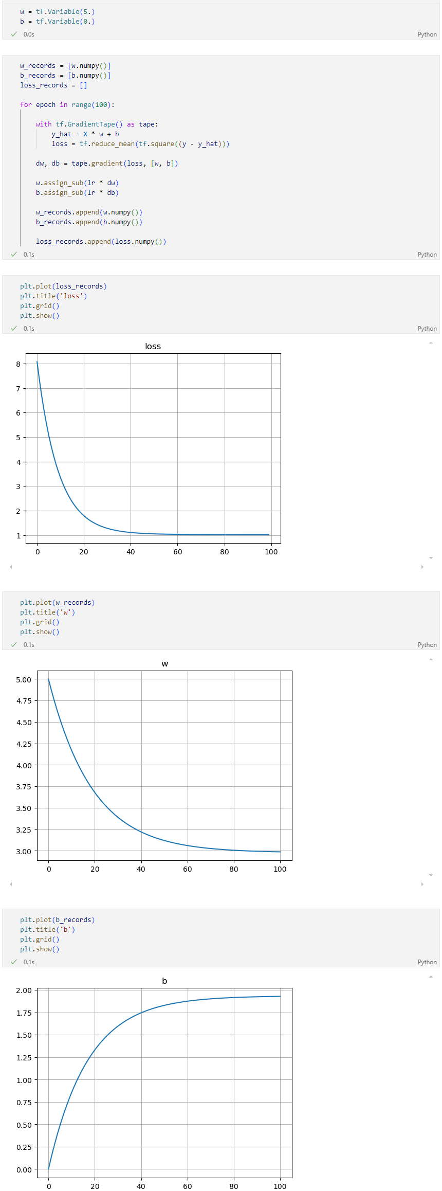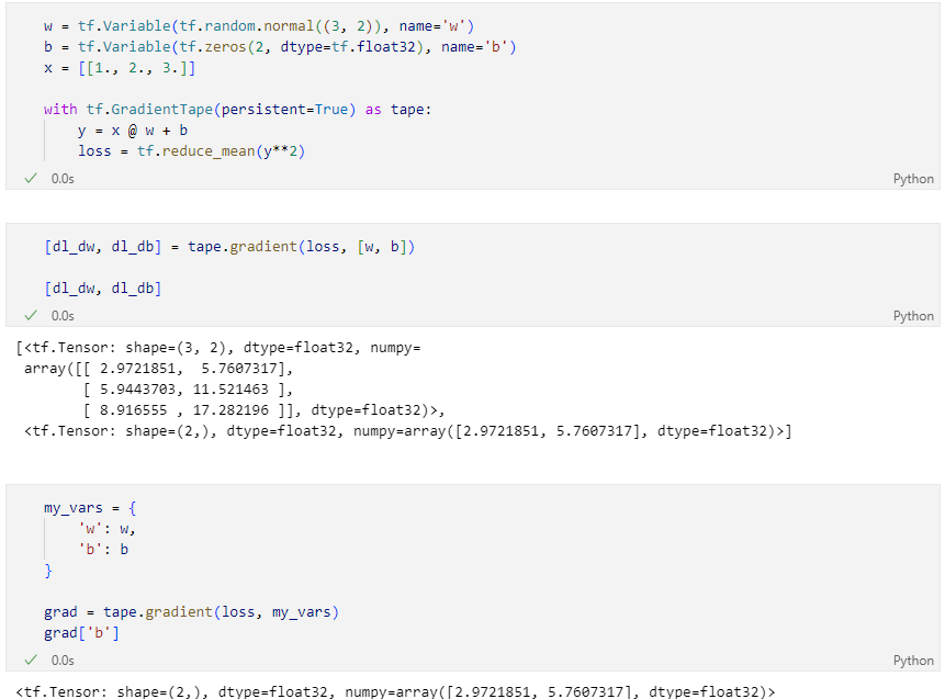 그 다음 텐서플로는 후진 방식 자동 미분(reverse mode differentiation)을 사용해 테이프에 "기록된" 연산의 그래디언트를 계산합니다.