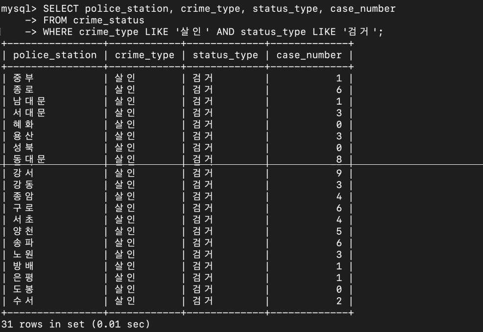 WHERE crime_type LIKE '살인' AND status_type LIKE '검거';