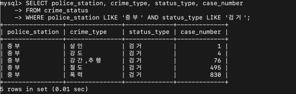 WHERE police_station LIKE '중부' AND status_type LIKE '검거';
