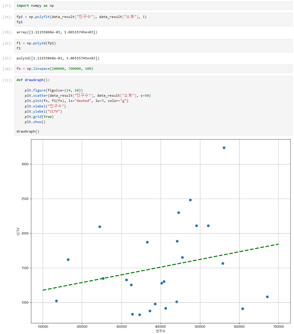 - np.poly1d(): polyfit 으로 찾은 계수로 파이썬에서 사용할 수 있는 함수로 만들어주는 기능