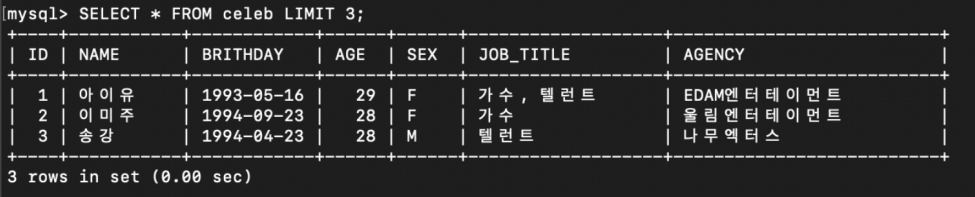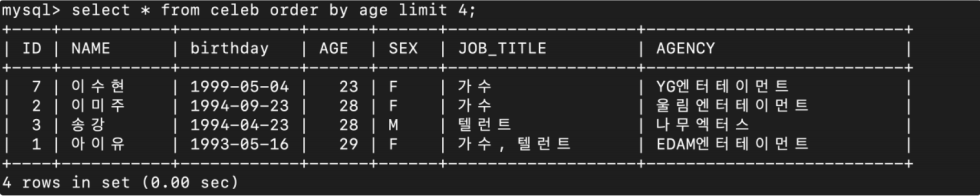SELECT * FROM celeb ORDER BY age LIMIT 4;