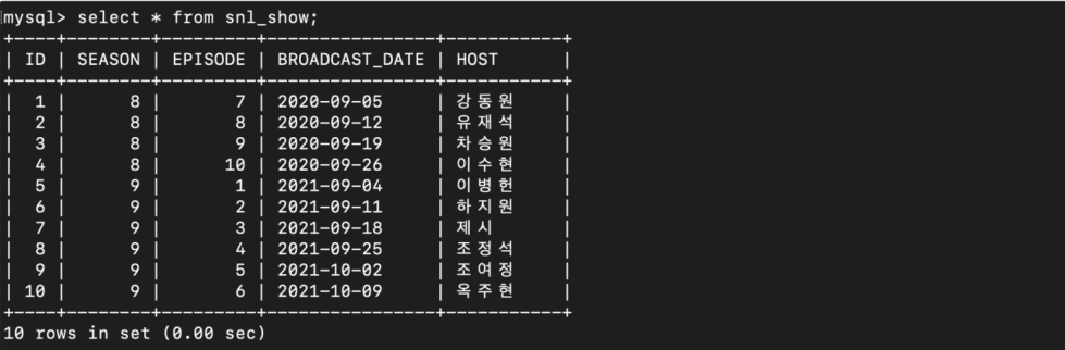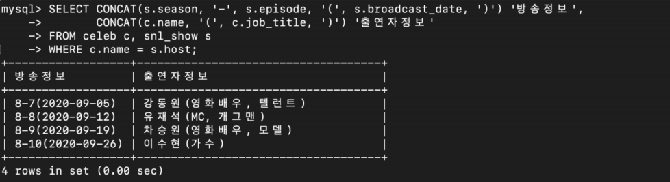 SELECT CONCAT(s.season, '-', s.episode, '(', s.broadcast_date, ')') '방송정보',