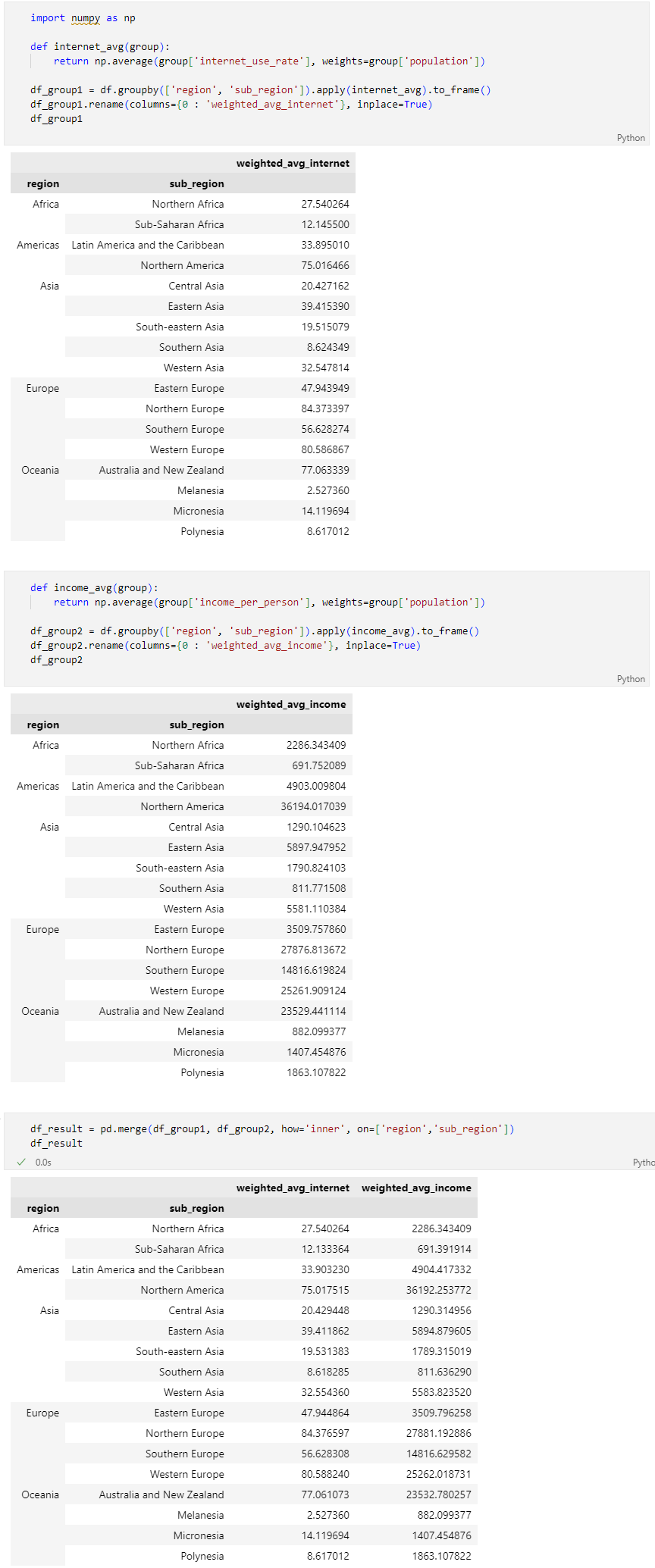 3단계 DataFrame(df)을 이용하여 지역대륙(sub_region)별 조건에 맞게 가중평균을 구하세요.