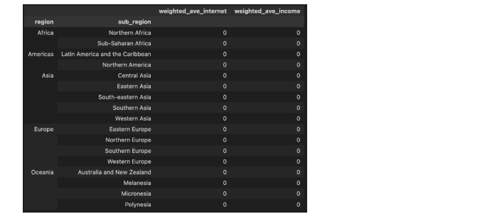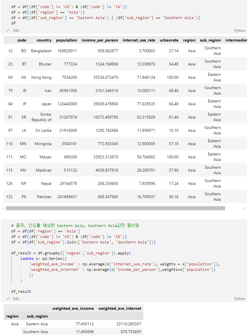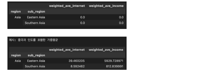 3단계 DataFrame(df)의 국가별 인터넷 사용률(internet_use_rate) 및 인당 소득(income_per_person)을 대륙(region) 또는 지역대륙(sub_region)별로 평균을 합산하여 보기 위해서는 단순 평균이 아닌 국가별 인구수(population)을 가중한 평균을 계산하여야 합니다.