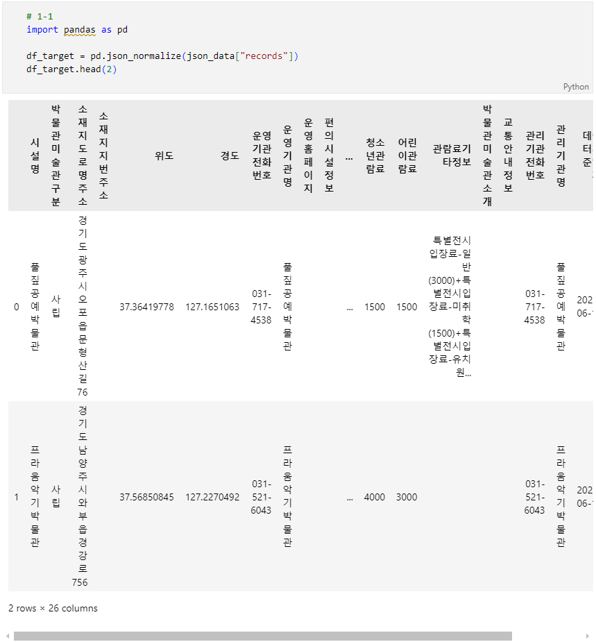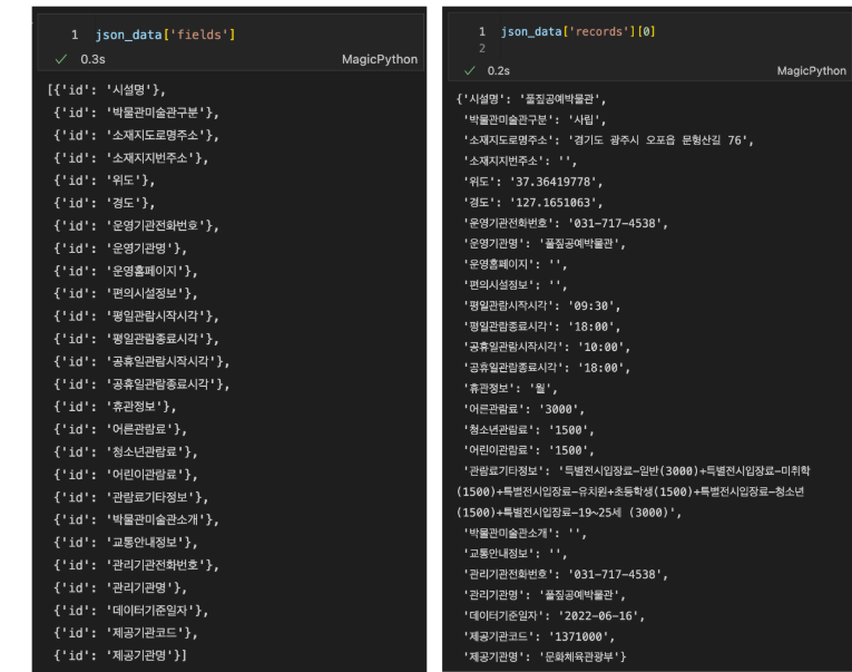 위에서 읽은 json_data는 아래와 같이 구성되어있습니다. 이를 참고하여 pandas dataframe으로 불러오세요.
