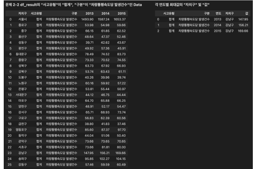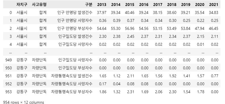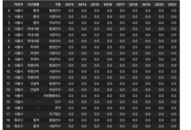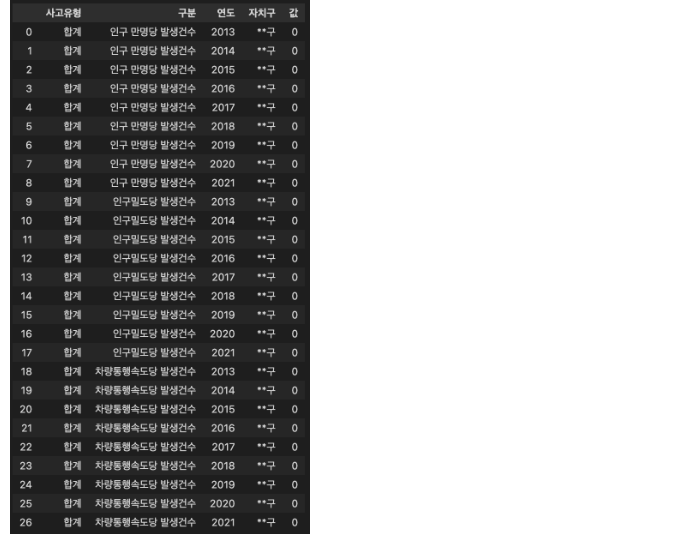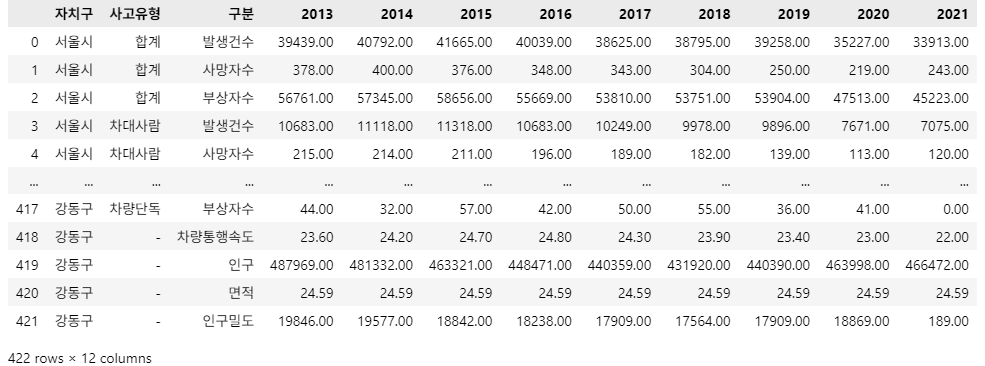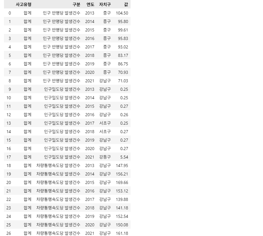 조건2: 결과 DataFrame의 Column(열)은 ['사고유형', '구분', '연도', '자치구', '값'] 입니다.