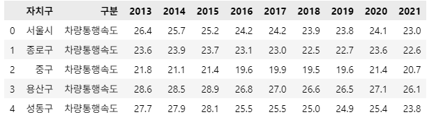 df_speed = pd.read_csv('./datas/차량통행속도(월별_구별).csv')