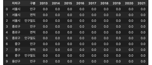 결과 DataFrame 예시: df_answer, '자치구'에 '**구' - '값'에 0 입력