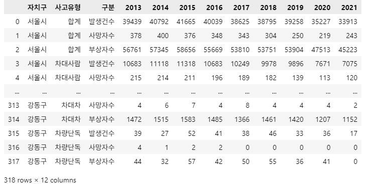 조건8: Column 순서는 ['자치구', '사고유형', '구분', '2013', '2014', '2015', '2016', '2017', '2018', '2019', '2020', '2021']로 해주세요.