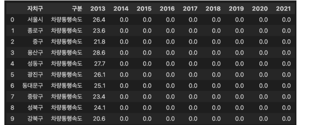 서울시 구별 차량통행속도 DataFrame을 수정하고자 합니다.