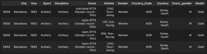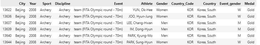 문제 1에서 만든 DataFrame을 이용하여 2008년 베이징 올림픽 양궁 종목에서 금메달을 획득한 선수들을 찾아보세요.