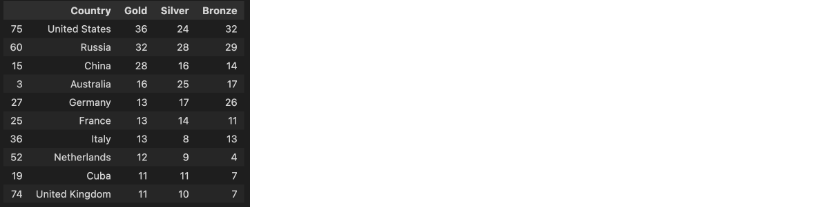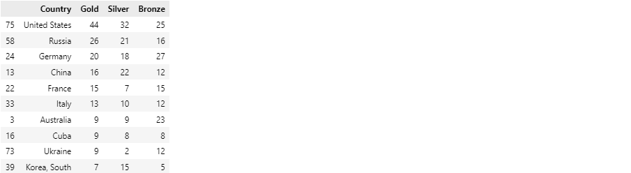 문제 1에서 만든 DataFrame과 Pandas 기능을 활용하여 아래 예시와 같은 형태의 금메달 개수 기준 상위 10개국 내역을 만들어주세요.