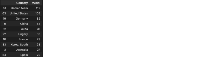 - 예시: 1992년 바르셀로나 올림픽 총 메달 개수에 따른 상위 10개 국가