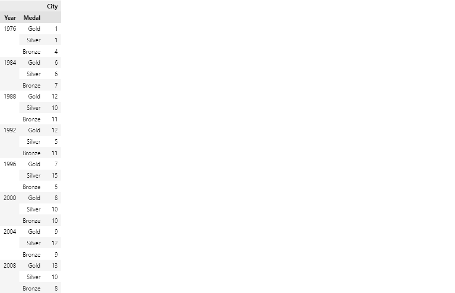 df_kor = df_kor.pivot_table(index=["Year","Medal"], values ='City', aggfunc="count")