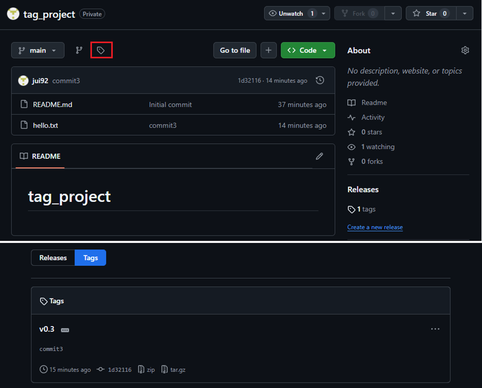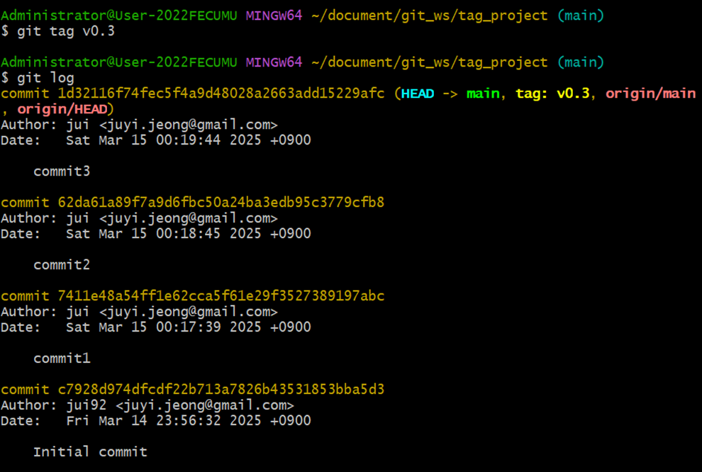 Git Tag 생성 1 실습 : 현재 버전 (Commit3) 에 Tag (v0.3) 달기