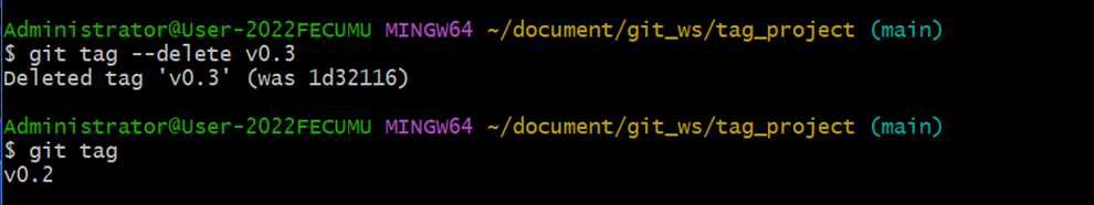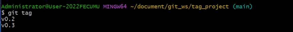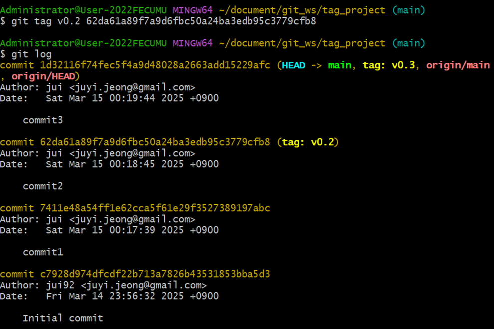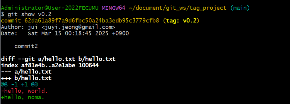 Git Tag 생성 2 실습 : 특정 버전 (Commit2) 에 Tag (v0.2) 달기