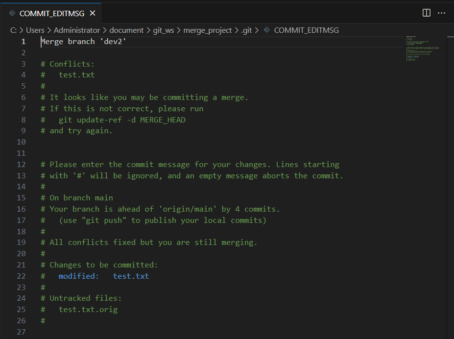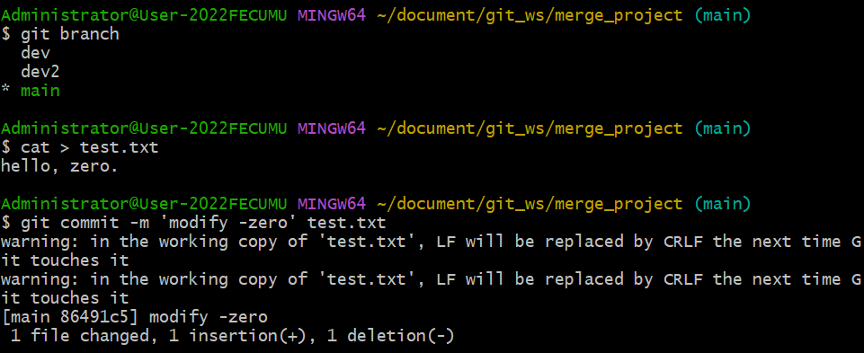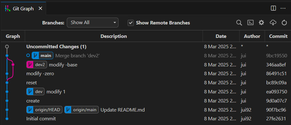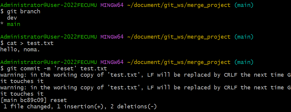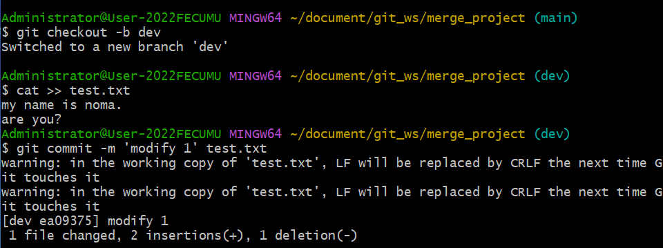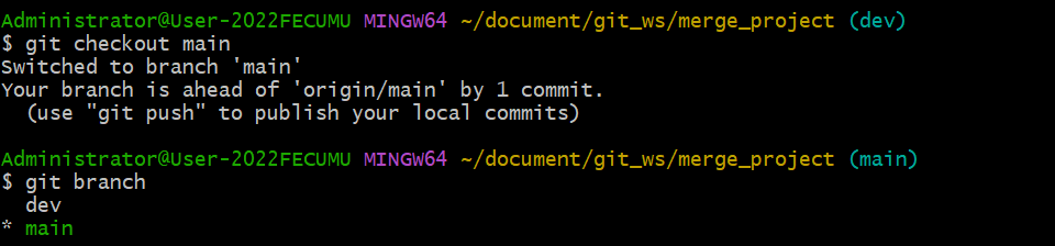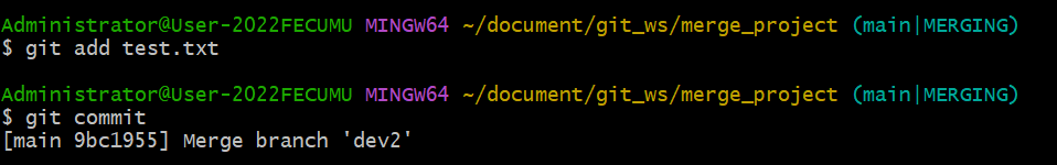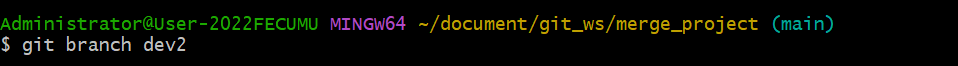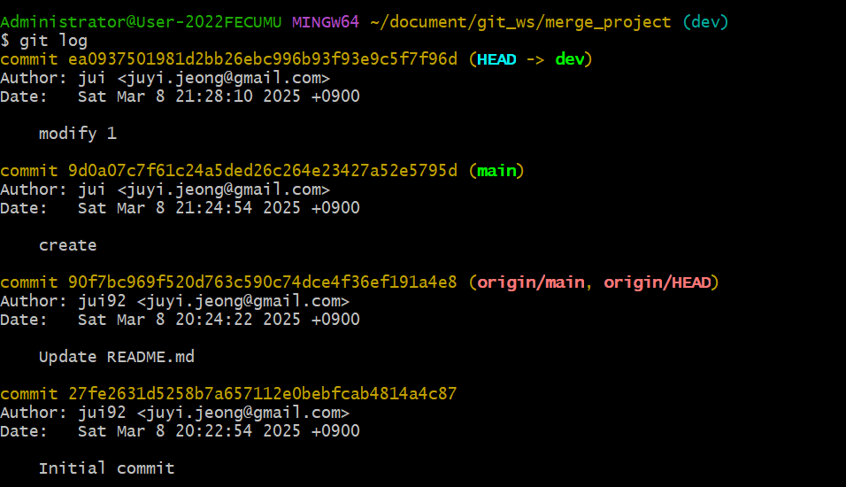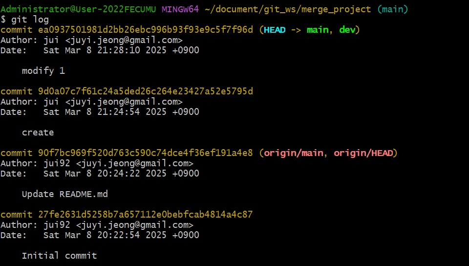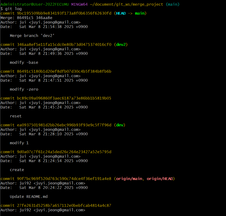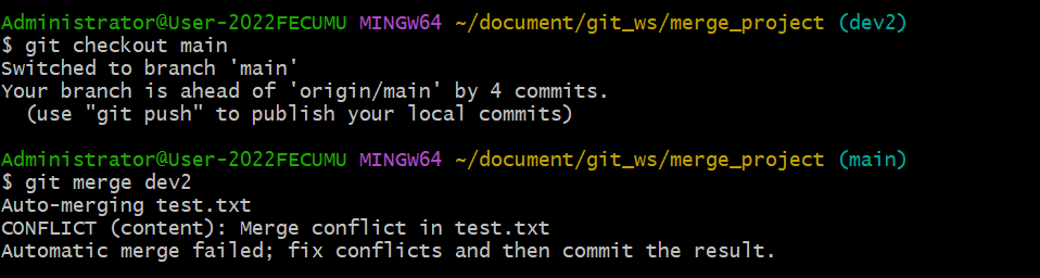 Main Branch 에서 Dev2 Merge : 이때 양쪽이 같은 파일의 같은 부분을 수정했기 때문에 Conflict 발생
