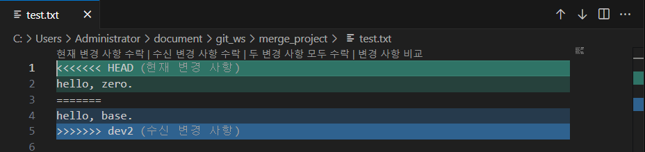 Main Branch 와 Dev2 Branch 의 Diff 를 <<<<, ====, >>>> 로 표시