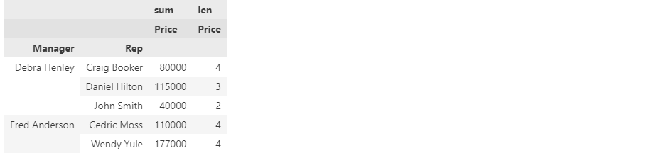 df.pivot_table(index=["Manager", "Rep"], values="Price", aggfunc=[np.sum, len])