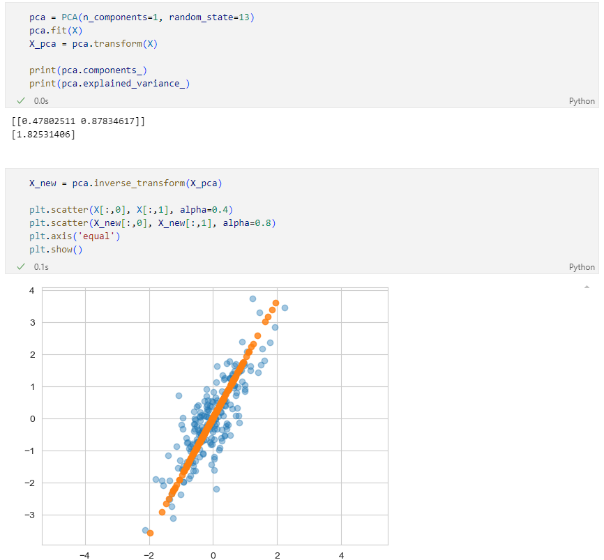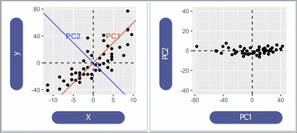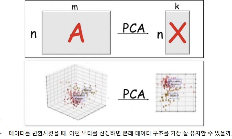 - PCA는 데이터의 분산(variance)을 최대한 보존하면서 서로 직교하는 새 기저(축)를 찾아,