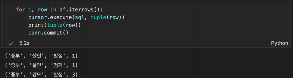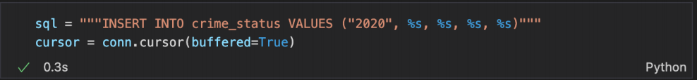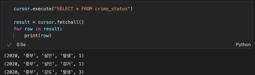 crime_status 테이블에 2020_crime.csv 데이터를 입력하는 코드를 작성