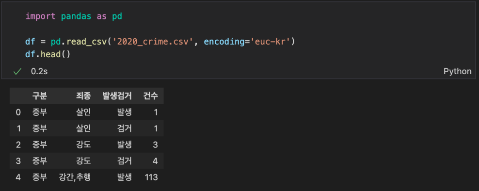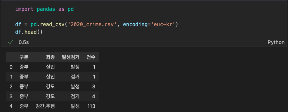2020_crime.csv 데이터(encoding='euc-kr') 읽어오기