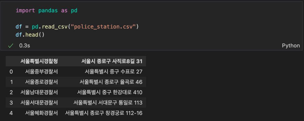 Read CSV : 제공받은 police_station.csv 를 Pandas 로 읽어와서 데이터를 확인
