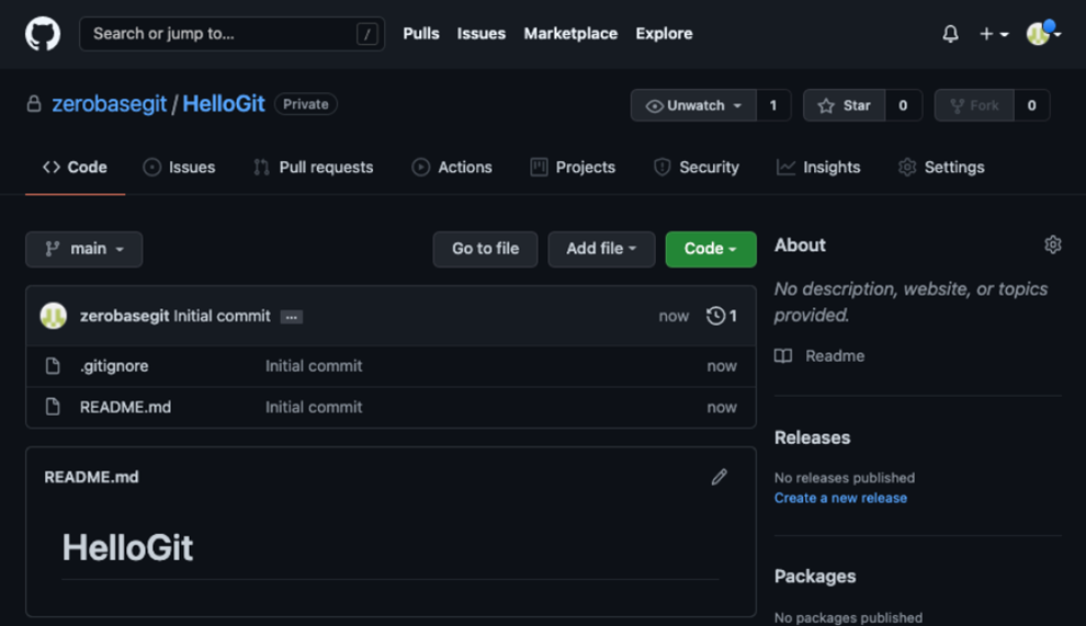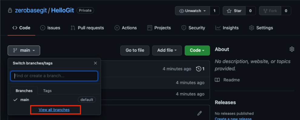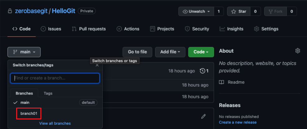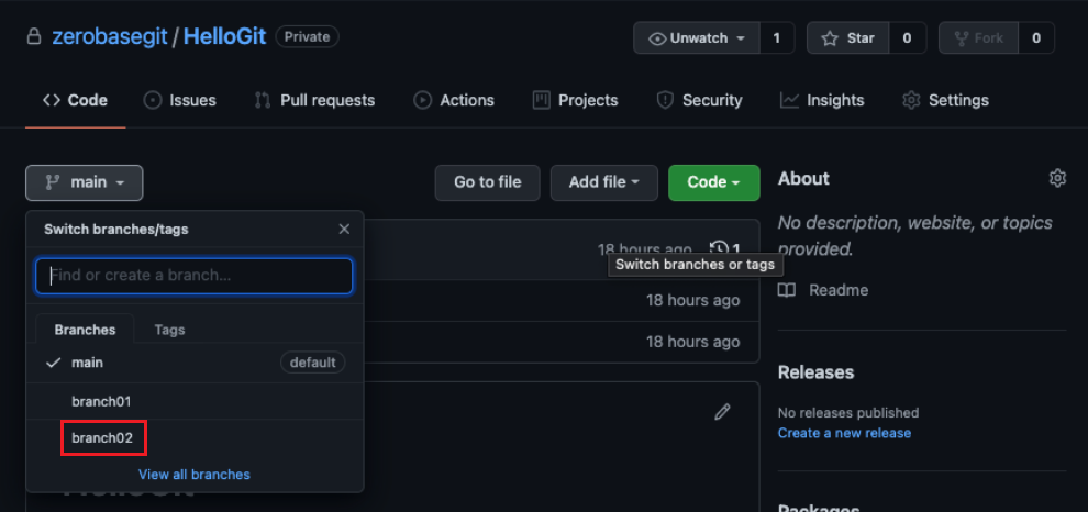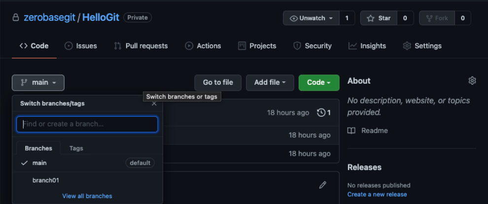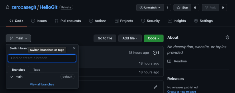 GitHub 에서 Branch 확인 : Local Repository 에 생성된 Branch 는 Remote Repository (GitHub) 에서 보이지않음