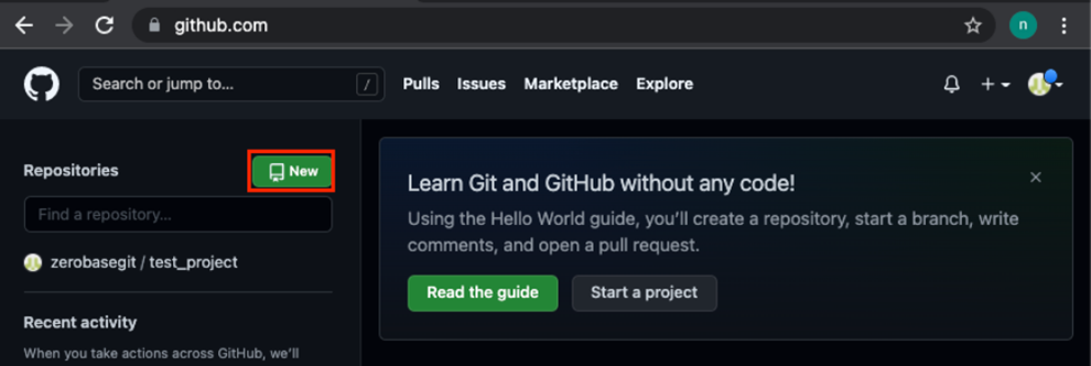 Git Home 에서 Repositoreis 'New' 버튼 선택