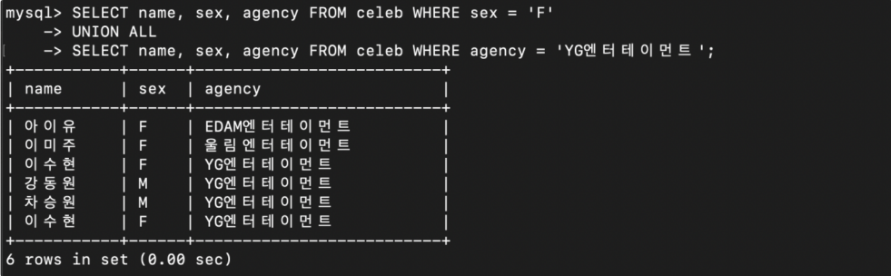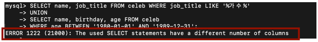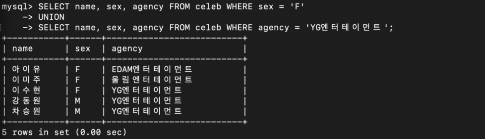 여러 개의 SQL문을 합쳐서 하나의 SQL 문으로 만들어주는 방법 (주의. 칼럼의 개수가 같아야함)